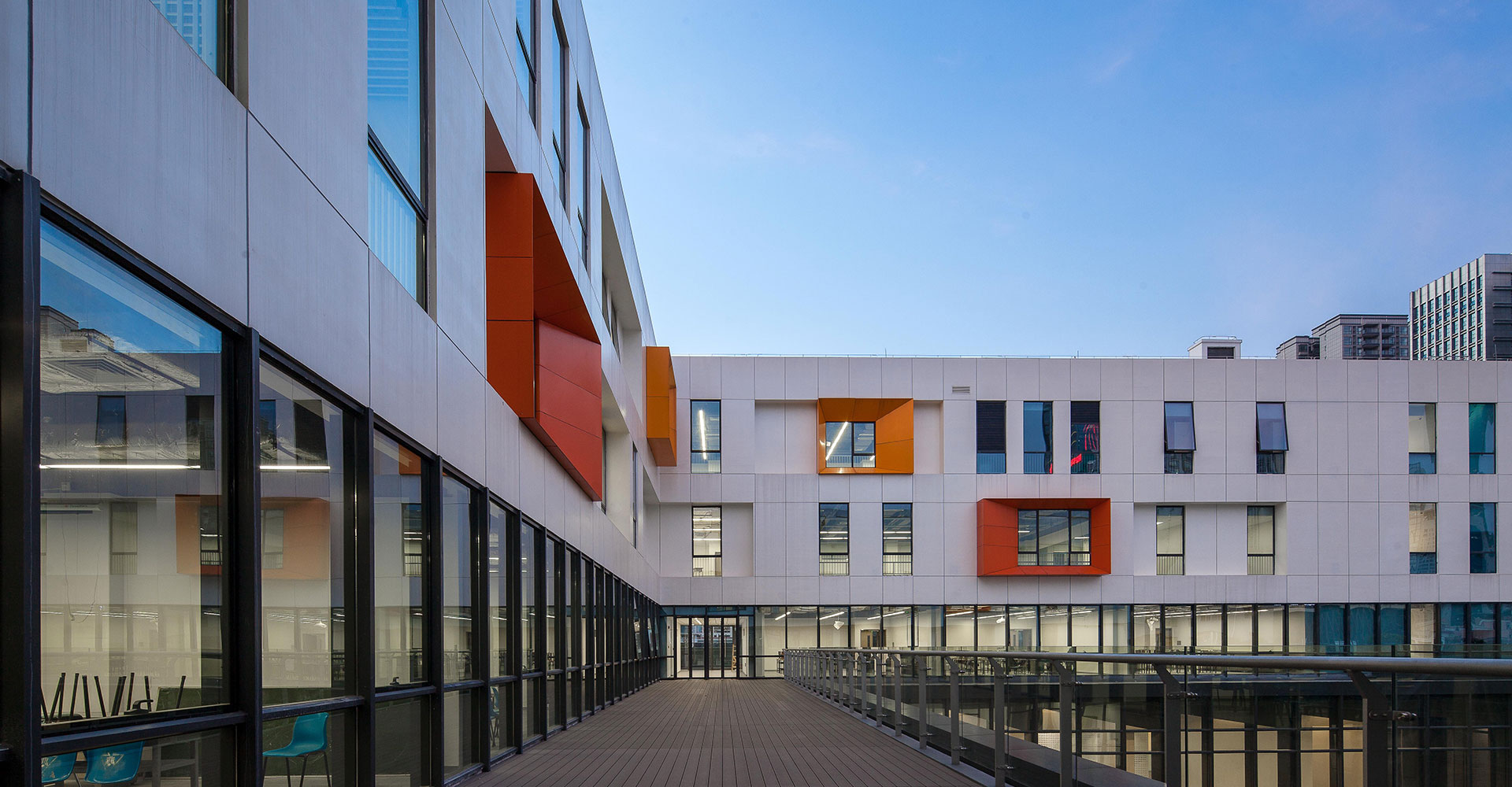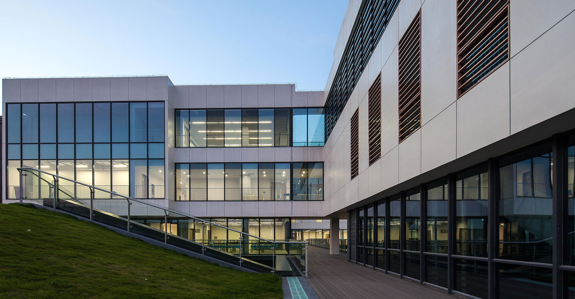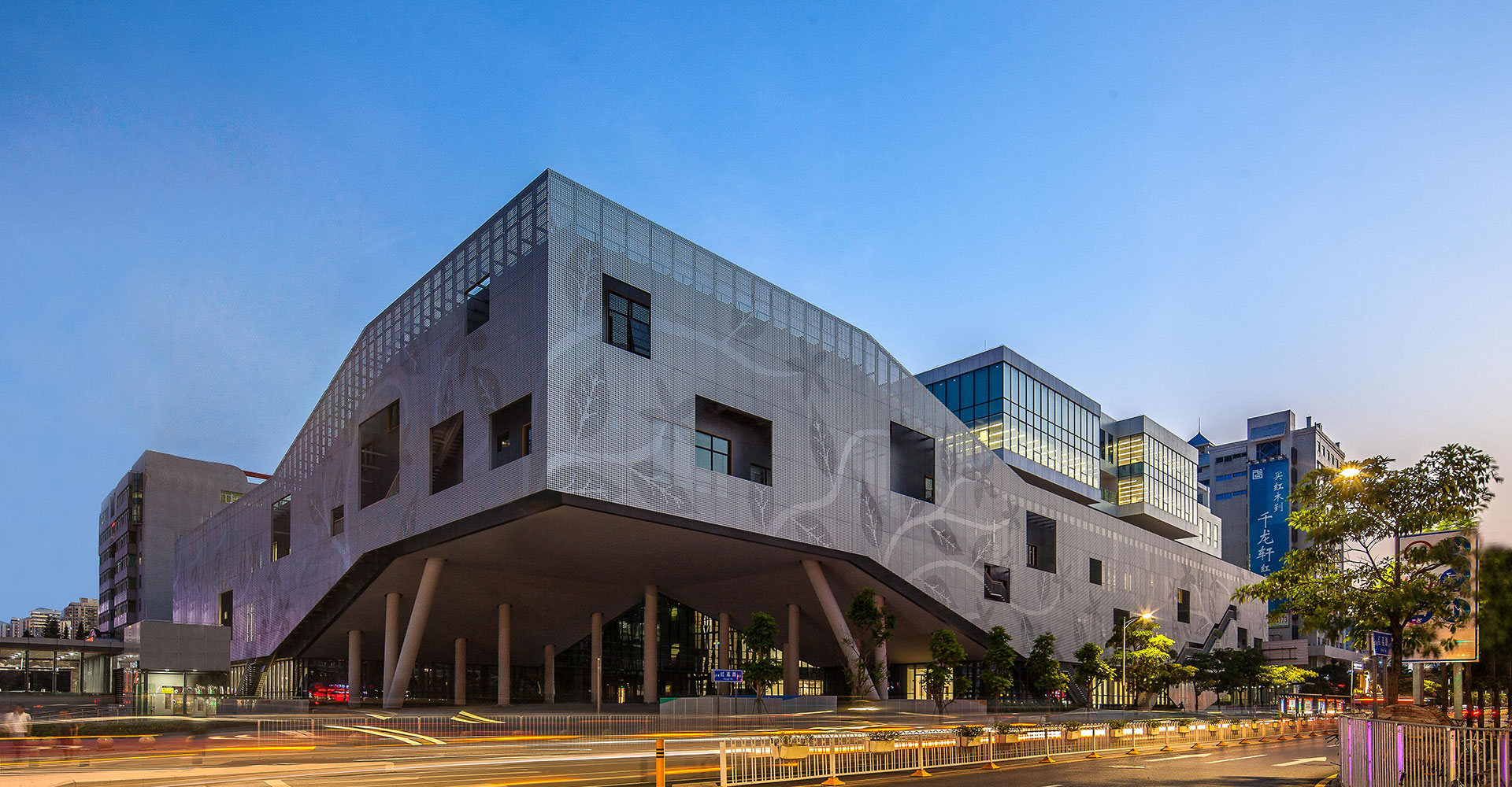 2-3層從建筑外墻外挑2米鋼結(jié)構(gòu)外掛沖孔鋁板幕墻,鋁板與外墻之間設(shè)豎向樓梯,解決2-3層展陳的疏散,為室內(nèi)營(yíng)造大空間提供了條件,鋁板幕墻還起到垂直擋板遮陽(yáng)和隔音的效果。