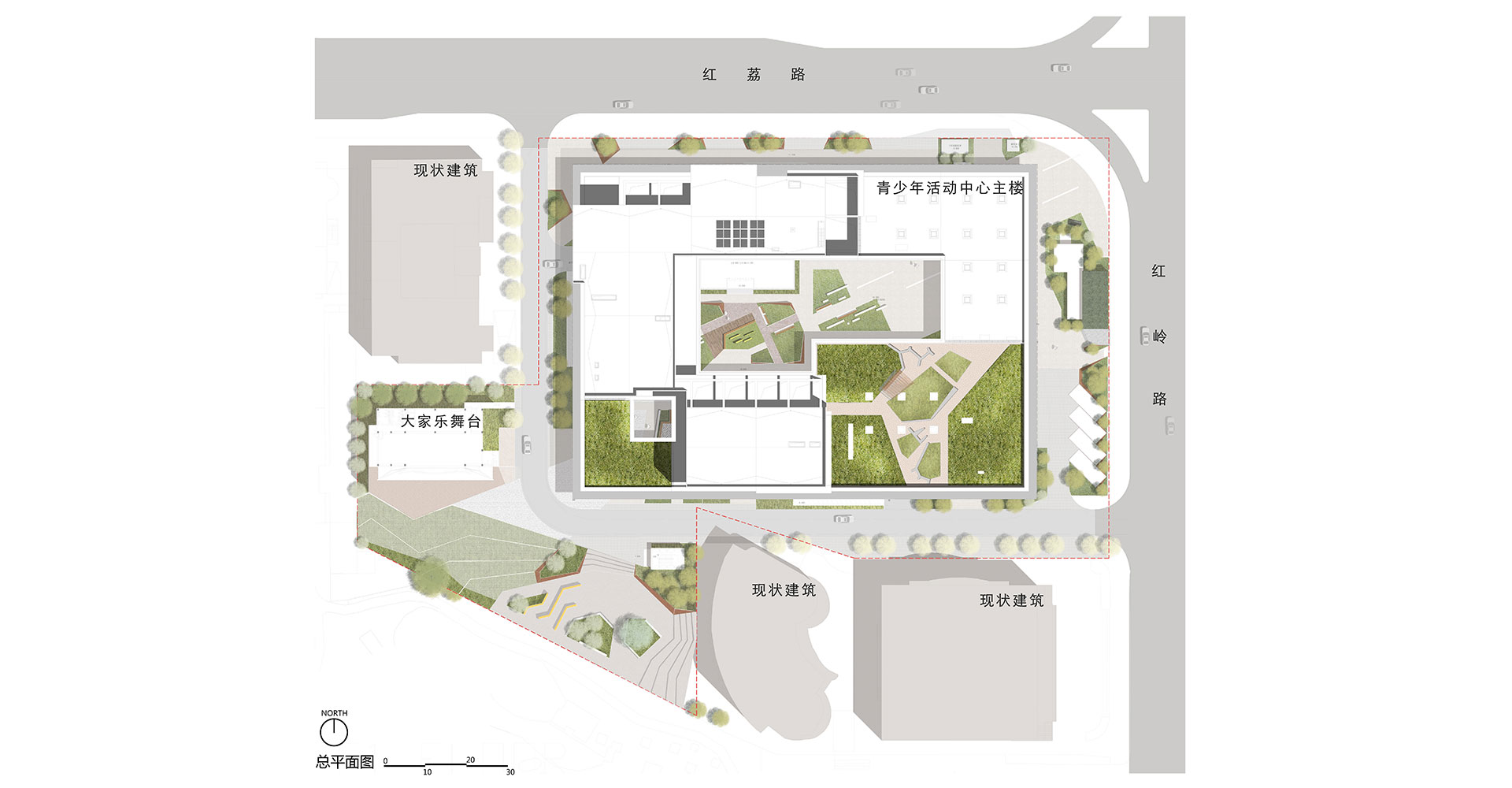 4、屋面及地面雨水收集,處理回用于室外綠化及澆灑道路,節(jié)省了水資源。