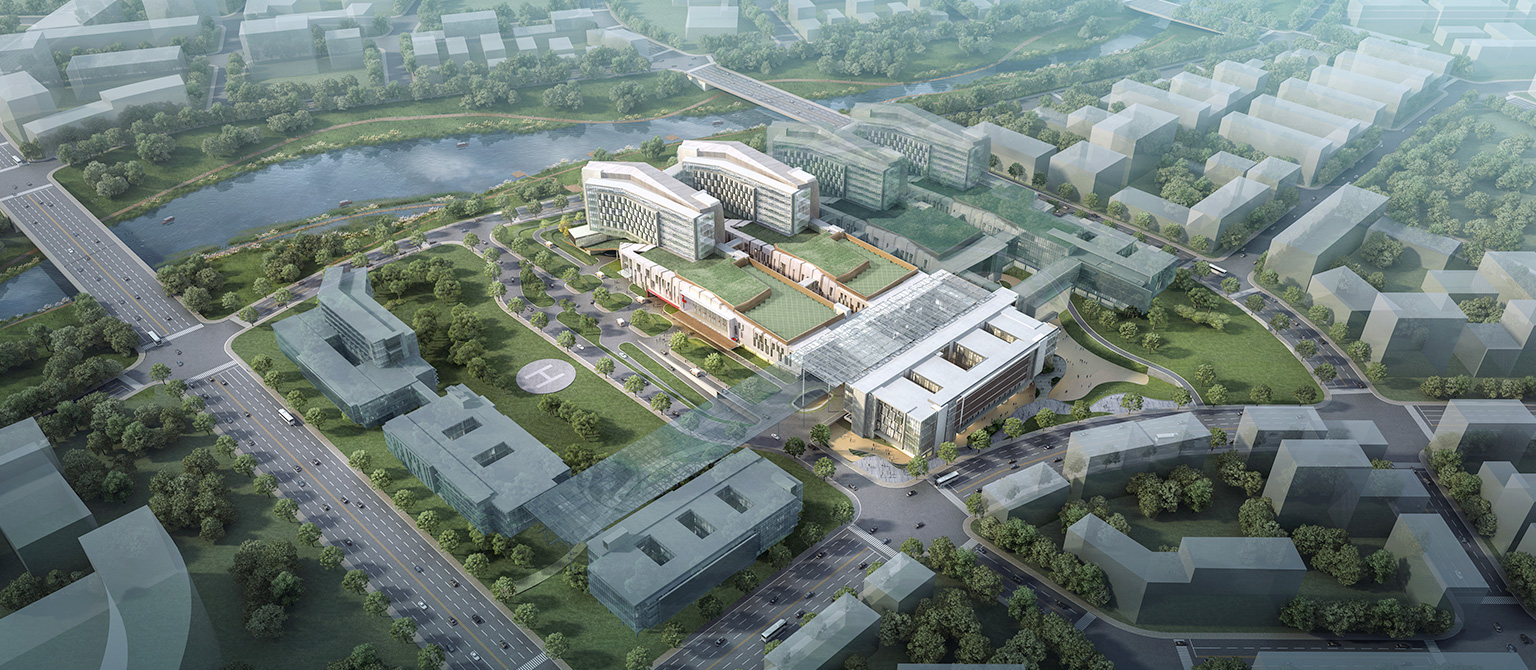 方案設(shè)計(jì)從白洋淀地貌汲取靈感,模擬淀泊形態(tài),將北側(cè)溪谷景觀引入并貫穿用地。根據(jù)《啟動(dòng)區(qū)控制性詳細(xì)規(guī)劃》中城市設(shè)計(jì)要求:“傳承中華營城理念,以藍(lán)綠空間為骨架,以模數(shù)化格網(wǎng)為基礎(chǔ),構(gòu)建秩序規(guī)整、平直方正、窄路密網(wǎng)的街區(qū)格局”。醫(yī)院各種交通公共空間、室外庭院將門診、醫(yī)技、住院等功能空間連結(jié)成一個(gè)互不干擾、又緊密聯(lián)系的生命體。