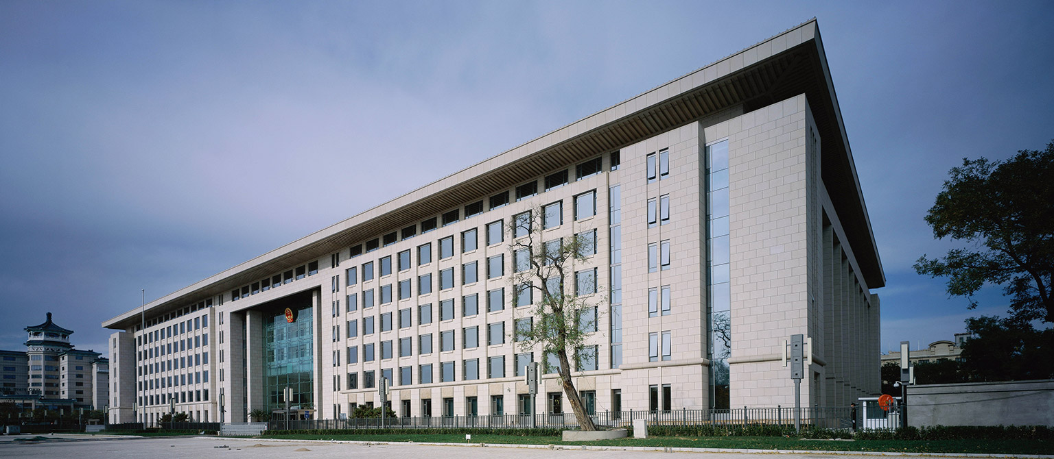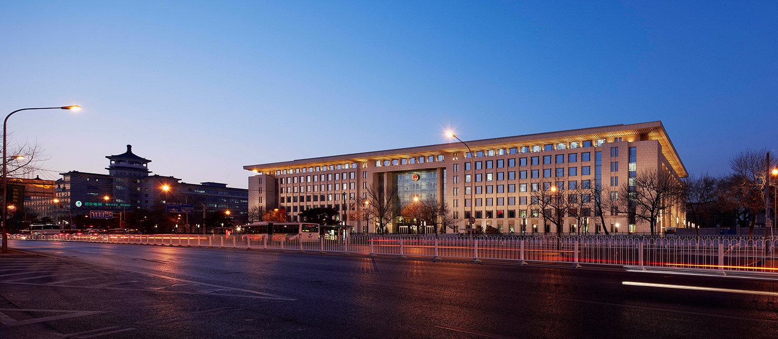 從建筑體量和建筑風(fēng)格上,人大機關(guān)辦公樓和廣場主要建筑物協(xié)調(diào)一致。人大機關(guān)辦公樓的地位從屬于人民大會堂,所以它的造型設(shè)計也很好地烘托大會堂,整個建筑風(fēng)格實用、穩(wěn)重、簡潔、樸實、親切,富有民族特色,而不喧賓奪主。借鑒中國古典建筑理念,以平緩的坡屋頂作為主要造型語言,和廣場建筑物相互呼應(yīng),并作為民族建筑語言的元素;東立面以連續(xù)柱廊或壁柱作為主要的墻身設(shè)計元素,和廣場建筑在建筑尺度上保持一定的延續(xù),避免瑣碎;南側(cè)公共空間采用透明玻璃幕墻,面向城市開敞,體現(xiàn)民主、透明的立法觀念,以避免保守、封閉、森嚴的外觀形象;墻身采用暖灰色花崗巖,和人民大會堂保持一致;主要立面采用方窗的形式,與辦公的使用性質(zhì)相適應(yīng)。