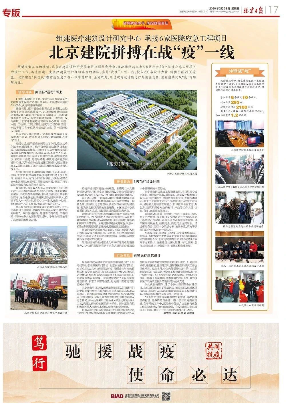 面對(duì)突如其來的疫情,北京市建筑設(shè)計(jì)研究院股份有限公司臨危受命,堅(jiān)決承擔(dān)起本市6家醫(yī)院共10個(gè)防疫應(yīng)急工程項(xiàng)目的設(shè)計(jì)工作,迅速組建一支醫(yī)療建筑設(shè)計(jì)經(jīng)驗(yàn)豐富的團(tuán)隊(duì),奔赴“戰(zhàn)疫”工程一線,投入293名設(shè)計(jì)力量,提供圖紙2100余張。北京建院“突擊隊(duì)”在防疫應(yīng)急工程一線奮勇沖鋒、全力以赴,用過硬的設(shè)計(jì)能力扛起國(guó)企責(zé)任,迸發(fā)出共同戰(zhàn)“疫”的磅礴力量。