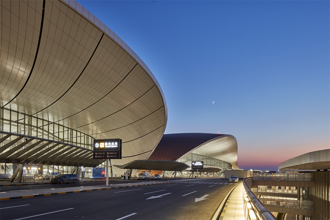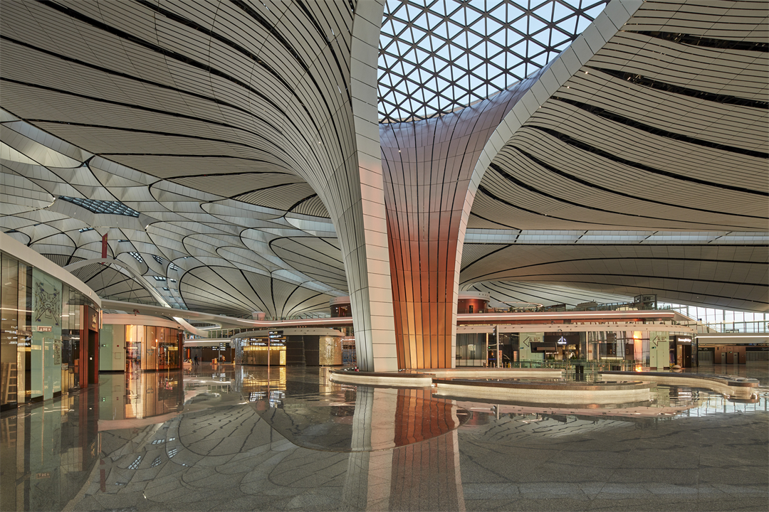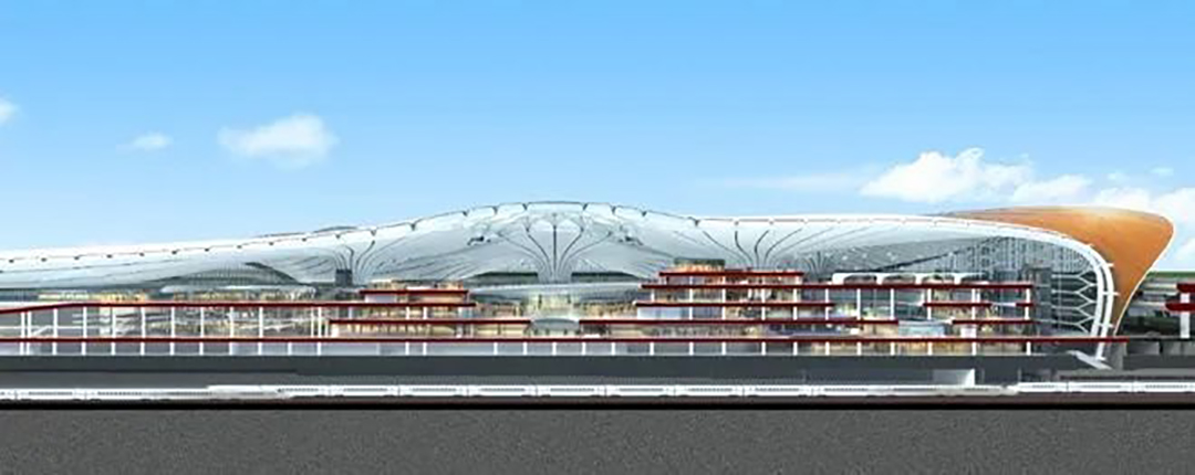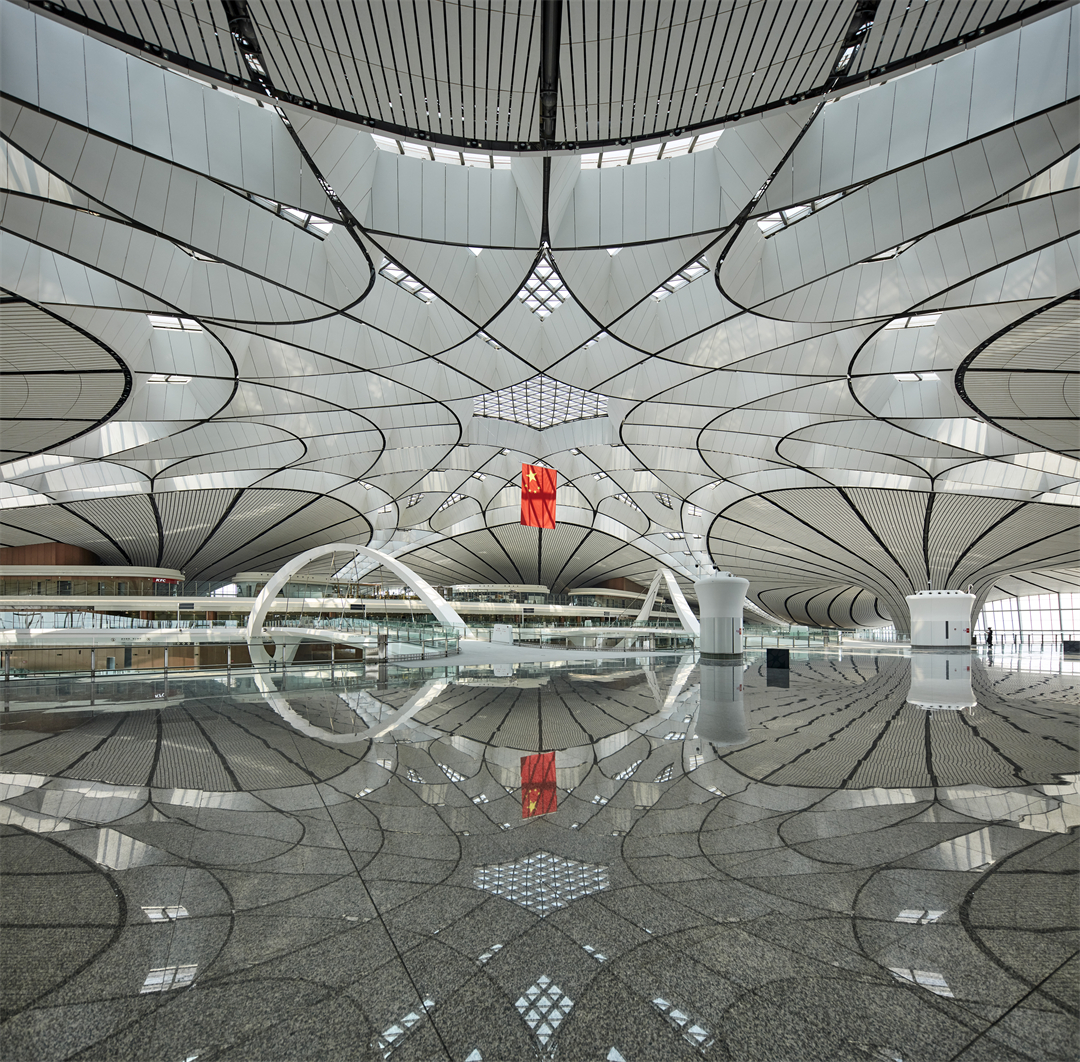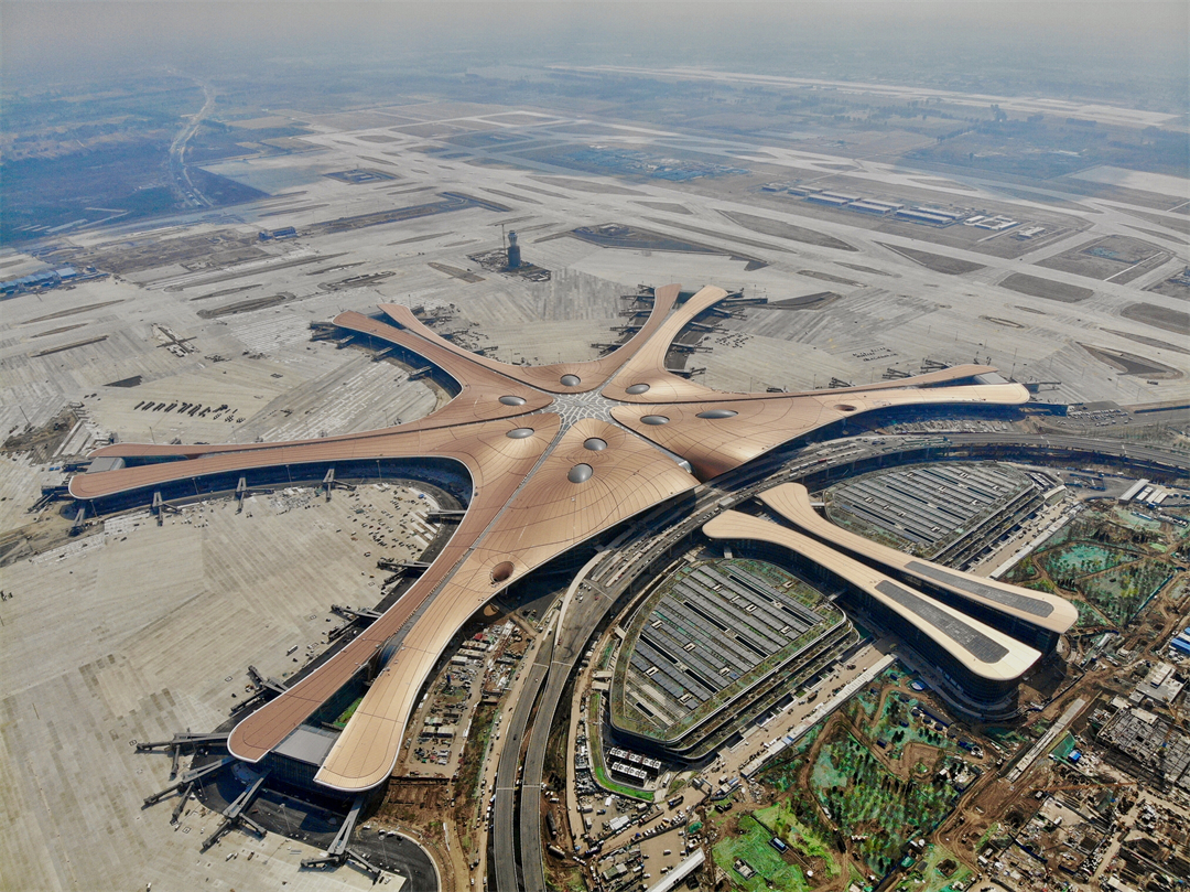 北京大興國際機場航站區(qū)總建筑面積約143萬平方米,主要包括航站樓、綜合換乘中心、軌道站房、停車樓、綜合服務(wù)樓等主要的建筑單元,其中航站樓及交通換乘中心建筑面積約78萬平米,屋蓋投影面積為35萬平米,建筑頂標高約為50米,屋蓋最大跨度為180米,最大懸挑為47米。航站樓南北長996米,東西寬1144米,由中心區(qū)及中央南和東北、東南、西北、西南5個指廊組成。工程于2016年開工,2019年6月底實現(xiàn)竣工驗收,當年9月25日正式投運。