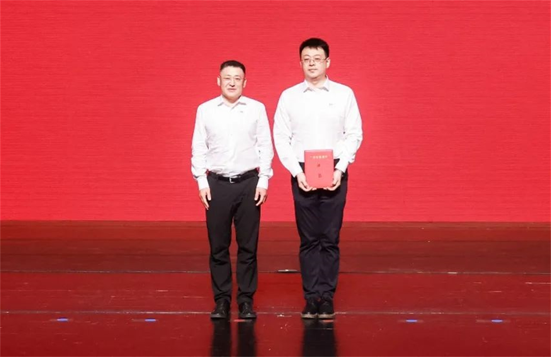 公司領(lǐng)導(dǎo)向受表彰的先進集體和先進個人代表頒發(fā)獎杯、獎?wù)潞妥C書