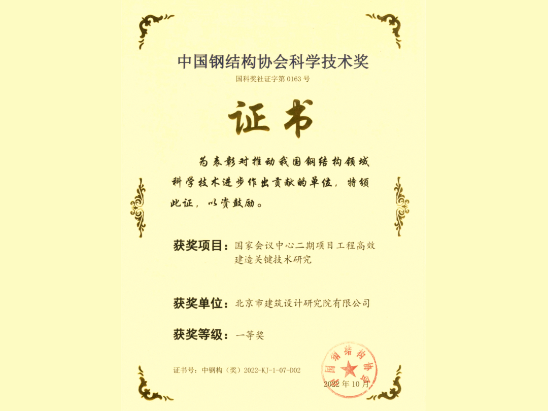 國家會議中心二期項目榮獲“第十五屆‘中國鋼結(jié)構(gòu)金獎’年度杰出工程大獎”、“2022年度中國鋼結(jié)構(gòu)協(xié)會科學(xué)技術(shù)一等獎”兩項鋼結(jié)構(gòu)大獎。