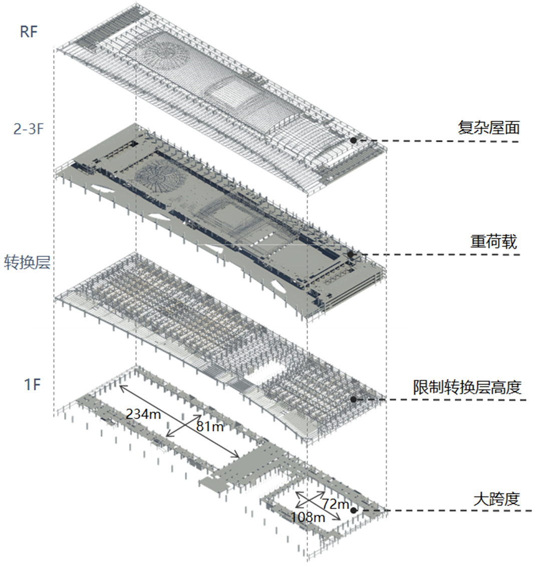 國家會議中心二期位于北京中軸線北側(cè),毗鄰國家會議中心一期和亞投行,總建筑面積41.9萬平方米。地下兩層、地上三層,地上平面尺寸約為456米×144米,主要檐口高度為44.85米。項目由首層大型會展、二層以會帶展、三層高端政務(wù)、峰會,這三大核心功能分區(qū)豎向“疊拼”組成。其中首層為81米×234米、72米×108米大跨空間,最大轉(zhuǎn)換結(jié)構(gòu)跨度81米,二層為12-36米高大空間,三層設(shè)有252米×72米室內(nèi)花園并在其中錯落布置午宴廳、峰會廳等附屬用房,花園上部拱形屋面設(shè)置玻璃天窗天幕系統(tǒng),屋蓋系統(tǒng)按結(jié)構(gòu)外露且需滿足中部天窗開合要求。
