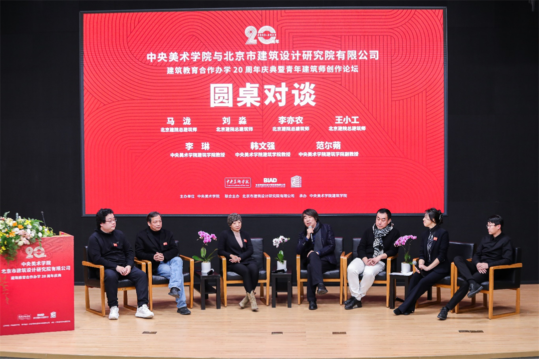 “青年建筑師創(chuàng)作論壇”同期舉行,北京建院副總建筑師石華、青年建筑師王錚,中央美院建筑學院教授韓文強、副教授范爾蒴分別就各自的創(chuàng)作思考和近期作品進行了分享和交流。隨后,北京建院總建筑師馬瀧、劉淼、李亦農、王小工,建筑學院教授韓文強、副教授范爾蒴,就“建筑師的職業(yè)樂趣和幸福感在哪里”“建筑師能力的培養(yǎng)”“女性建筑師在設計院中的位置與價值”“如何培養(yǎng)有藝術家素養(yǎng)”“人文素養(yǎng)的建筑師”等議題進行圓桌對談,建筑學院黨總支副書記李琳主持活動。
