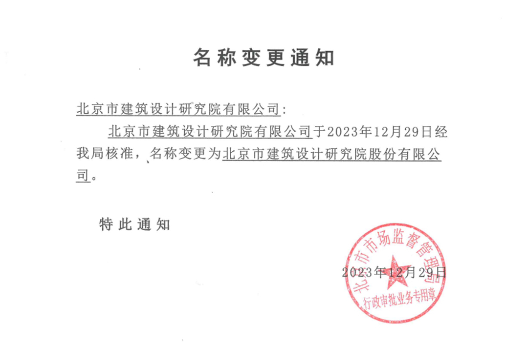 2023年,北京建院在北京產(chǎn)權(quán)交易所完成公開掛牌增資引戰(zhàn),募資12.75億元,成功引入以航天投資控股有限公司為代表九家戰(zhàn)略投資者,完成混合所有制改革,完成股份公司設(shè)立的各項(xiàng)工作。經(jīng)公司股東大會(huì)通過,經(jīng)北京市市場監(jiān)督管理局核準(zhǔn),12月29日起,北京市建筑設(shè)計(jì)研究院有限公司正式更名為“北京市建筑設(shè)計(jì)研究院股份有限公司”,完成股份制改革。