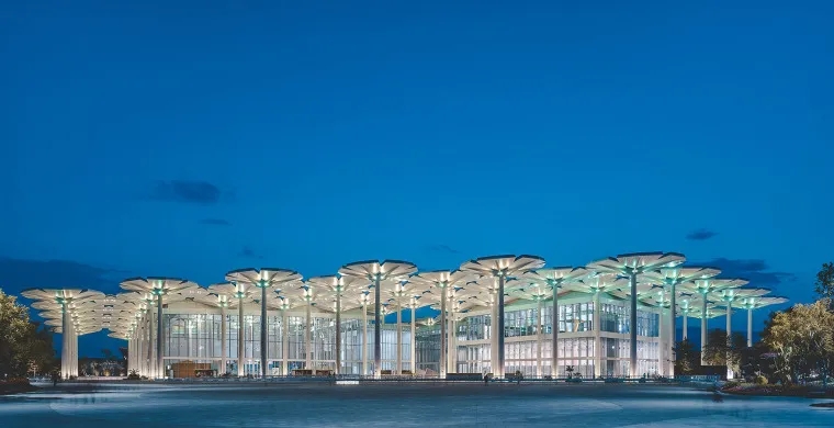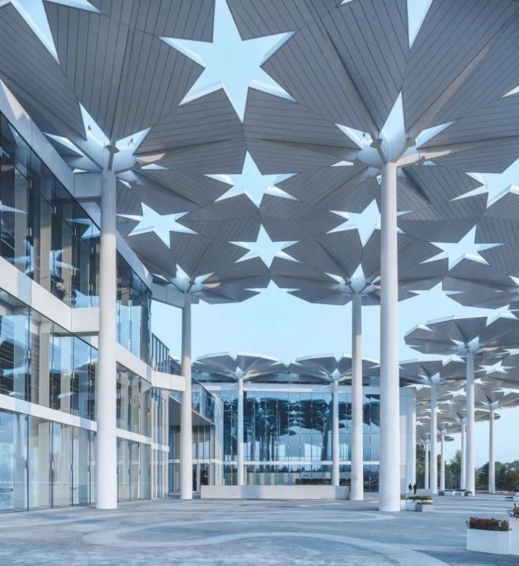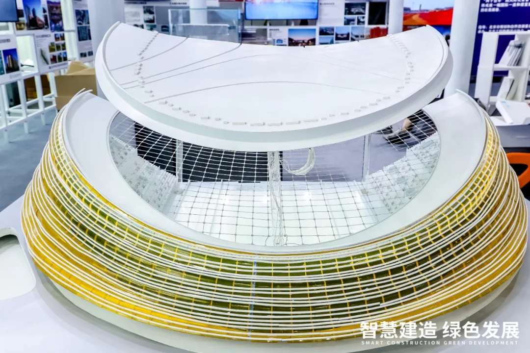 尤為值得一提的是,此次展區(qū)設(shè)計取意于2021年市優(yōu)公共建筑綜合獎一等獎獲獎項目:2019年中國北京世界園藝博覽會國際館,將“花傘”作為主題元素。2019年中國北京世界園藝博覽會國際館由北京建院設(shè)計,坐落在北京西北延慶區(qū)的媯水河畔,地上二層,地下一層,總建筑面積為22,000平方米。項目創(chuàng)新應用數(shù)字化設(shè)計方法與綠色建筑技術(shù)于一體,實現(xiàn)高度和坡度均不相同94朵花傘的數(shù)字化設(shè)計與建造,不僅為設(shè)計過程提供完整技術(shù)平臺,而且極大的提高從方案設(shè)計到施工全過程的數(shù)字化控制精度,同時結(jié)合花瓣形態(tài)的花傘一體化結(jié)構(gòu)單元,將雨水回收、太陽能光伏發(fā)電、蒸發(fā)冷卻降溫、自然采光、遮陽等眾多綠色技術(shù)集于一體,極大的推動建筑數(shù)字化設(shè)計、控制及建造等全系統(tǒng)聯(lián)動,結(jié)合綠色建筑技術(shù)的應用,對倡導建筑行業(yè)的可持續(xù)發(fā)展理念,積極引導大力發(fā)展綠色建筑,建設(shè)資源節(jié)約和環(huán)境友好型社會,促進節(jié)能省地型建筑的發(fā)展,具有十分重要的意義。